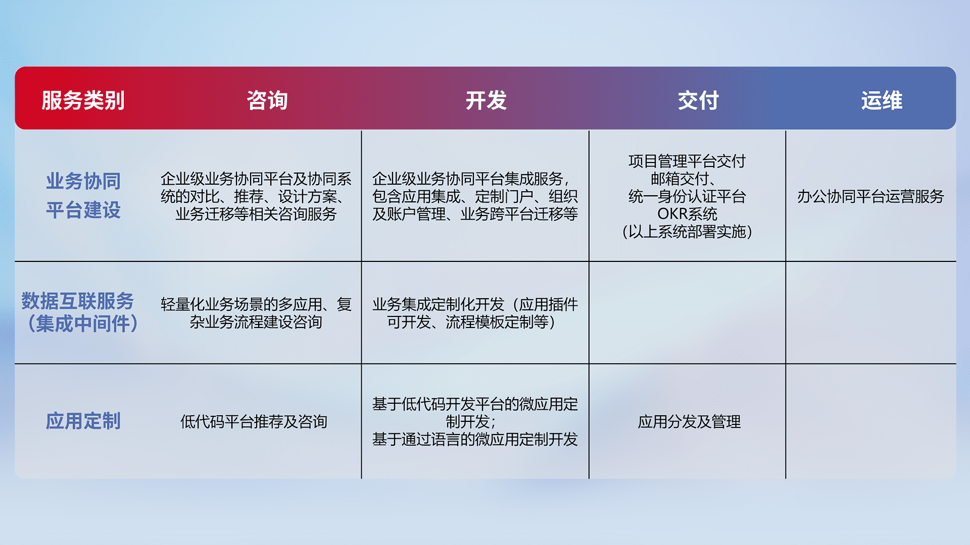 针对钉钉、、、企微、、、、IDaas等平台级产品提供产品的规划、、、方案、、、交付、、、、定制化开发等服务,,实现如统一协同办公、、、、智能客户服务、、、混合会议管理、、、智能数据查询、、、、等业务场景,,实现数字化转型。。。